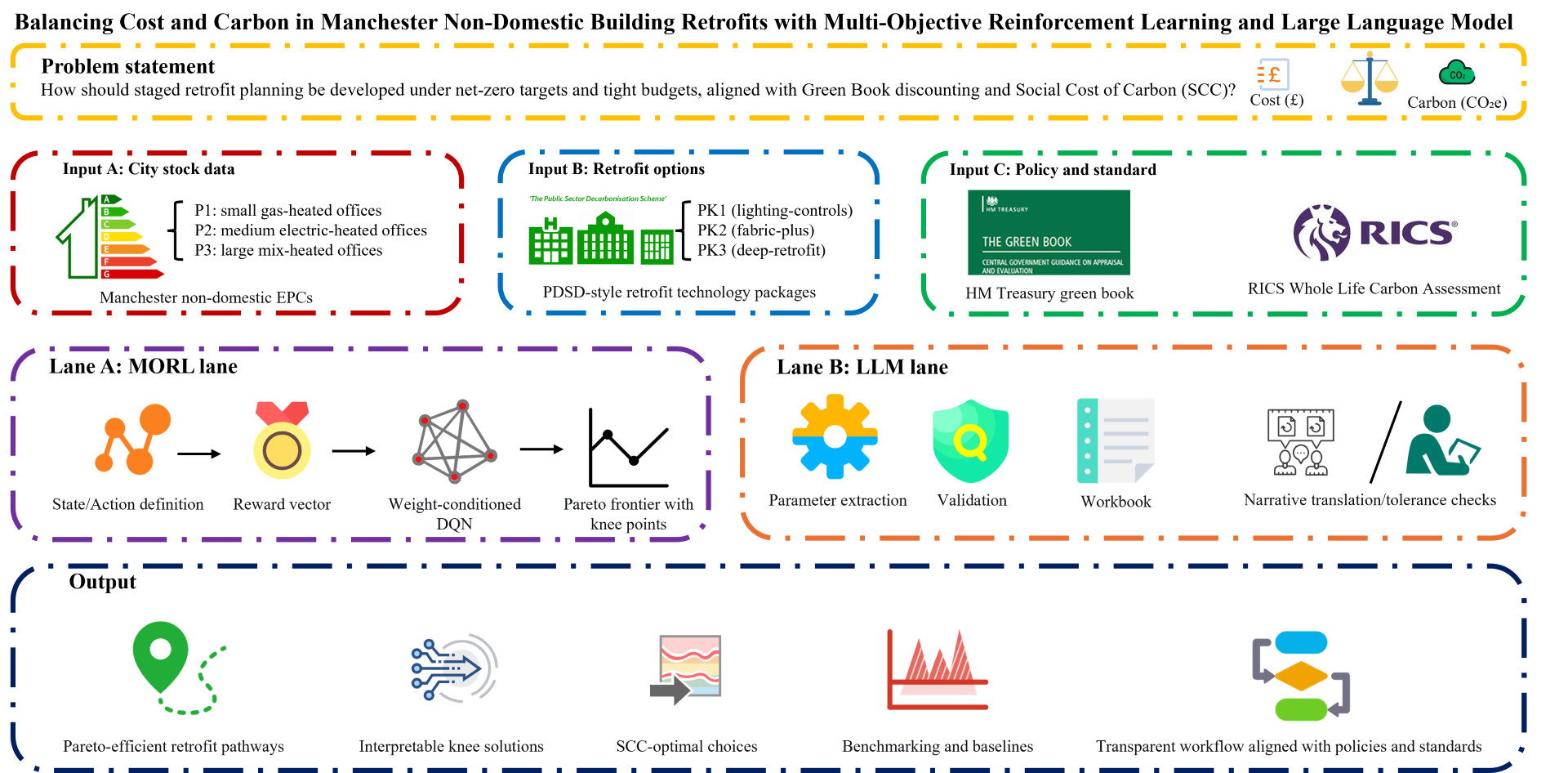 Balancing cost and carbon in Manchester non-domestic building retrofits with multi-objective reinforcement learning and large language model